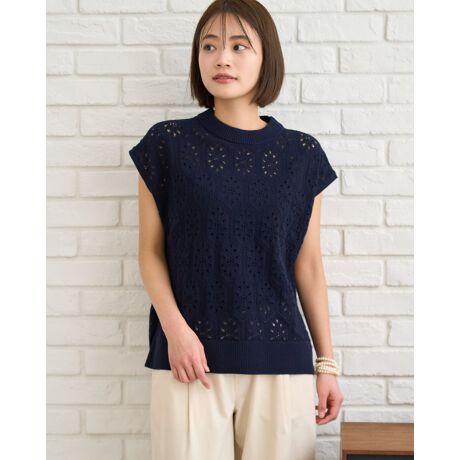 ボディ全体に10cmほどの大きさで編まれたダイヤの透かしが華やかなニットベスト。ほのかな艶感でナチュラルになり過ぎず地金のジュエリーやキレイめなボトムスと合わせてオフィスでの着用も◎ボディのシアー感に反し、少し詰まったネックラインが肌の露出を抑え品の良さがうかがえる点もポイント。軽いハイゲージで気温に応じてインナーを長袖から半袖、タンクトップと変化させノースリーブスタイルでお召しになっても素敵です。