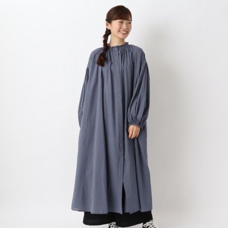 襟のフリルとギャザーでふんわりやさしい雰囲気のワンピース。