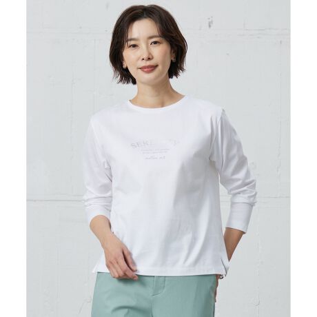 箔プリントのロゴが輝く、滑らかで上品な質感のカットソー