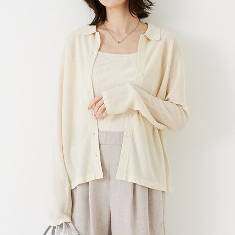 繊細なシアーの編地に小さいスパンコールがさりげなくきらめくニットシャツ。身体に沿いすぎないサイジングが着やすく、ボタンを閉めてプルオーバーとして着たり、開けて織りとしても活躍します。同素材のタンクトップとアンサンブルも可能です。
