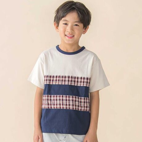 無地とチェックの生地の切り替えがお洒落な男の子用の半袖Tシャツ。