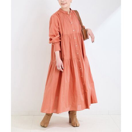 スタンドカラーでいわゆるシャツワンピをティアード切り替えで段々とボリュームを出しているのがポイント。