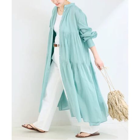 スタンドカラーでいわゆるシャツワンピをティアード切り替えで段々とボリュームを出しているのがポイント。