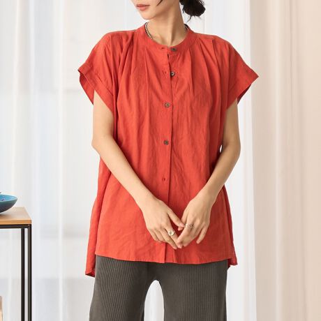 すっきりとしたバンドカラー×フレンチスリーブの抜け感のあるブラウス。