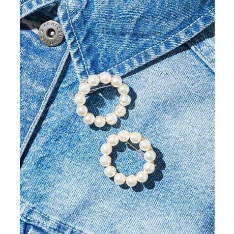 サークル型のパールモチーフが胸元に映えるデザインブローチ。フェミニンスタイルはもちろん、カジュアルなデニムにプラスしたアクセント使いに最適なひと品です。留め具はフックピンタイプで簡単に着脱が可能。メタルパーツと合わせた上品な雰囲気も魅力です。洋服はもちろん、ハットやスカーフなど、様々なアイテムに合わせていただけます。※モデル着用画像は、光の当たり具合で色味が違って見える場合がございます。※お使いのモニター環境によって商品の色味が違って見える場合がございます。
