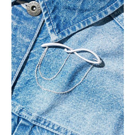 クールテイストなマットメタルでデザインしたオリジナルブローチ。ニュアンスあるラインにプラスしたダブルの華奢なチェーンが動くたびに揺れ動く魅力的なデザインです。シンプルなピン留めタイプで洋服からハットなど様々な用途で活躍。カジュアルなデニムに合わせる上品なアクセントとしてもおすすめです。※モデル着用画像は、光の当たり具合で色味が違って見える場合がございます。※お使いのモニター環境によって商品の色味が違って見える場合がございます。