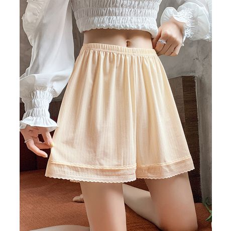裾に施されたレースデザインが可愛らしさを引き立て、見た目も華やかでおしゃれなペチパンツです。