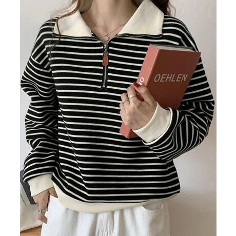 シンプルでありながら洗練された雰囲気を持つボーダー柄ポロカラーニットトレーナーが新登場