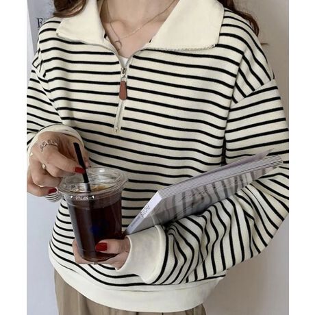 シンプルでありながら洗練された雰囲気を持つボーダー柄ポロカラーニットトレーナーが新登場