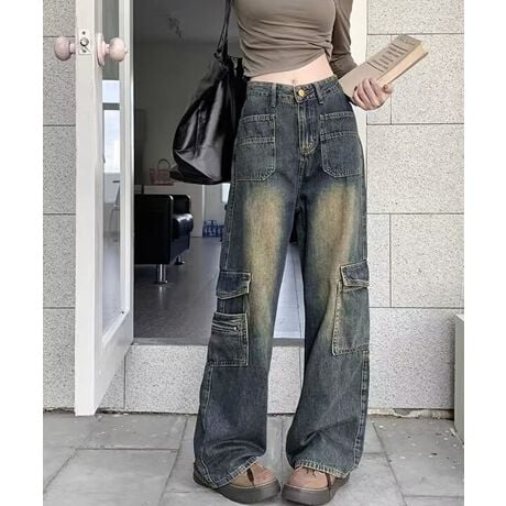 デニム素材とカーゴデザインを融合させた、ユニークなレディースストリート系ロングジーンズ