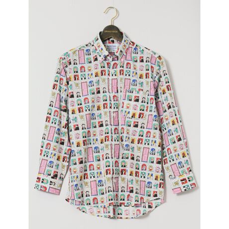 着映え度抜群、コーディネートの主役になるボタンダウンの長袖シャツです。ロックスターや音楽家のコスプレをした動物とロンドンのアパートをイメージしたプリントで、POPな大人カジュアルを楽しめます。左胸ポケット付きで利便性にも優れています。