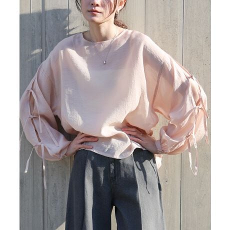 袖のスリットにリボンをあしらった、程よいシアー加減が魅力の春らしいブラウスです。光沢のある柔らかい生地が女性らしさを際立たせます。ボディラインを拾わないゆったりめのドロップショルダーで、リラクシーなサイジングも魅力的。タックアウトでお召し頂いても腰までの着丈で安心感があります。落ち着きのあるペールトーンで大人の抜け感スタイルを叶える1枚です。