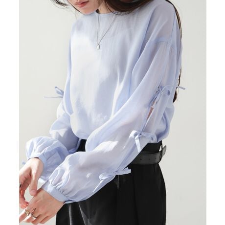 袖のスリットにリボンをあしらった、程よいシアー加減が魅力の春らしいブラウスです。光沢のある柔らかい生地が女性らしさを際立たせます。ボディラインを拾わないゆったりめのドロップショルダーで、リラクシーなサイジングも魅力的。タックアウトでお召し頂いても腰までの着丈で安心感があります。落ち着きのあるペールトーンで大人の抜け感スタイルを叶える1枚です。