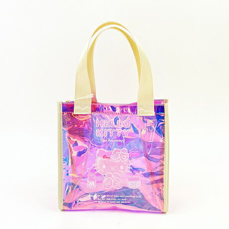 オーロラがゆめかわいいクリアトートバッグです♪ ハローキティ50周年を記念したオーロラミニトート◎ちょっとしたお出かけに便利なサイズ感です☆PVC素材で水にも強いので雨の日でもお出かけできますよ♪