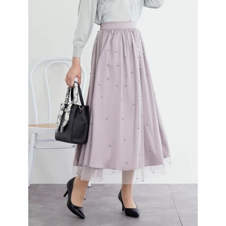 チュール素材に散りばめられたパールが目を惹くデザインのロングスカート
