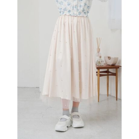 チュール素材に散りばめられたパールが目を惹くデザインのロングスカート