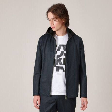 小さな通気孔のあるストレッチ・ファブリックを使用したフード着脱式の軽量ブルゾンです。