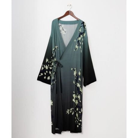 [型番:7IA-5102-2025]カシュクール型の長丈羽織。大胆に描かれた梅の柄と淡い色合いがやさしい印象を与え、結び紐を用いれば着物風の装いもお楽しみいただけます。レーヨン素材の軽やかな生地で涼しく、UVカット加工が施されているため日除けとしても活躍します。春のお出かけにおすすめの上品な羽織です。UVカット