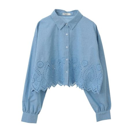 裾のスカラップトリムが目を惹くボタンダウンシャツ。アイレット刺繍で表現した透かし模様が華やかな一着です。クロップド丈×ワイドなボックスシルエットがトレンド感のあるバランス。デニムに合わせてカジュアルダウンさせたり、フェミニンなアイテムと合わせてきれいめなスタイリングもお楽しみいただけます。