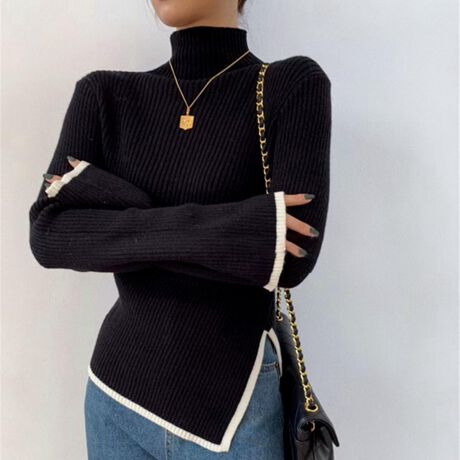 ベーシックなハイネックニットですが袖はフレアに、裾はスリットを入れることで女性らしいシルエットが完成しました。<br>