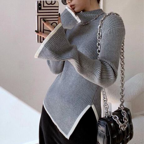 ベーシックなハイネックニットですが袖はフレアに、裾はスリットを入れることで女性らしいシルエットが完成しました。<br>