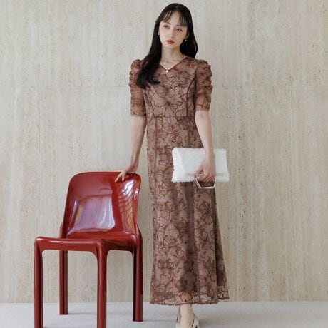 スパンコールを織り交ぜた花柄の刺繍素材を贅沢に使ったワンピースドレス。