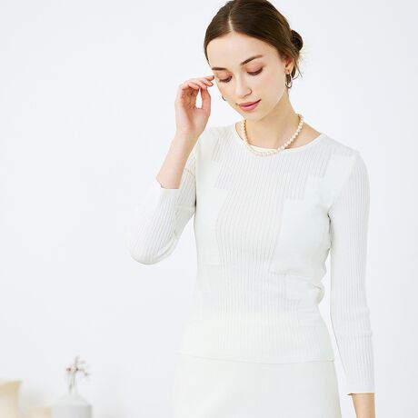 シンプルな中にさりげない地柄が上品な雰囲気のニット。清潔感のあるオフ、春らしく綺麗な色味のイエロー、合わせやすいダークブルーの二色展開。