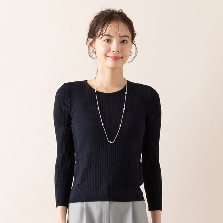 シンプルな中にさりげない地柄が上品な雰囲気のニット。清潔感のあるオフ、春らしく綺麗な色味のイエロー、合わせやすいダークブルーの二色展開。