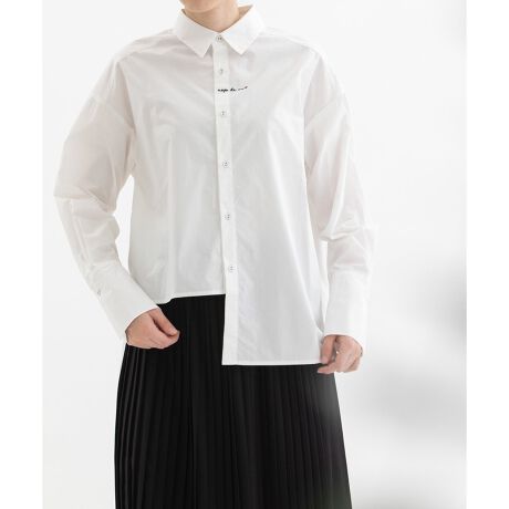 アシメトリーな裾で簡単にこなれたレイヤードがかなうデザインシャツ。フロントとバックにさりげなくロゴ刺繍を入れました。後ろが長めの前後差デザイン、長めのカフスは折り返しもしやすくなっています。刺繍=フロント:nop de nod バック:「私の好きな」を仏語で入れています。