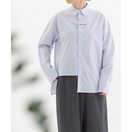 アシメトリーな裾で簡単にこなれたレイヤードがかなうデザインシャツ。フロントとバックにさりげなくロゴ刺繍を入れました。後ろが長めの前後差デザイン、長めのカフスは折り返しもしやすくなっています。刺繍=フロント:nop de nod バック:「私の好きな」を仏語で入れています。
