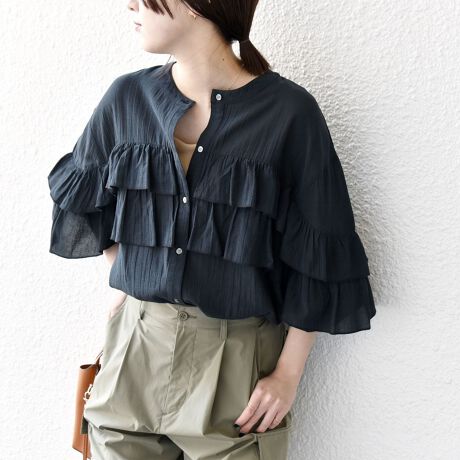 SHIPS any:〈洗濯機可能〉シアー ボイル フリル バンドカラー シャツ ブラウス