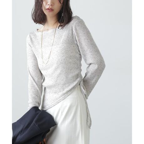 メランジ調のニットソー素材のデザイントップス。メランジカラーでカジュアルな雰囲気を演出し、シンプルながらもアクセントになるカットソーです。裾はアシンメトリーヘムデザインで、左脇は共地リボンで絞れるドロスト仕様。首は広めで抜け感があるのでカットソー同士のレイヤードや、ジャケットやカーディガンのインナーとしてもバランスよく着られます。ポイントはアシメヘムなので、シンプルにデニムパンツを合わせるだけでもスタイリングが決まります。※モデルの着用画像の場合、光の当たり具合により、実際の色味と異なって見えることがございます。色味は、商品単体の画像をご参照ください。