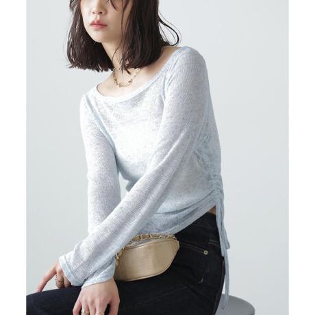 メランジ調のニットソー素材のデザイントップス。メランジカラーでカジュアルな雰囲気を演出し、シンプルながらもアクセントになるカットソーです。裾はアシンメトリーヘムデザインで、左脇は共地リボンで絞れるドロスト仕様。首は広めで抜け感があるのでカットソー同士のレイヤードや、ジャケットやカーディガンのインナーとしてもバランスよく着られます。ポイントはアシメヘムなので、シンプルにデニムパンツを合わせるだけでもスタイリングが決まります。※モデルの着用画像の場合、光の当たり具合により、実際の色味と異なって見えることがございます。色味は、商品単体の画像をご参照ください。