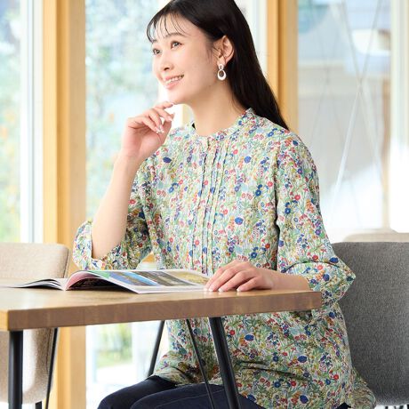 パンツスタイルを女性らしく彩るリバティプリントのシャツ。