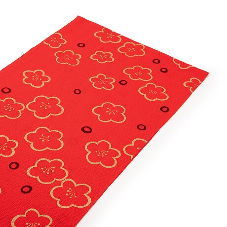 縮緬(ちりめん)地に梅の花や丸がデザインされています。