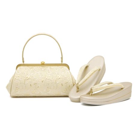バッグと鼻緒には、輝く糸で唐草模様を織り込んだデザインで、