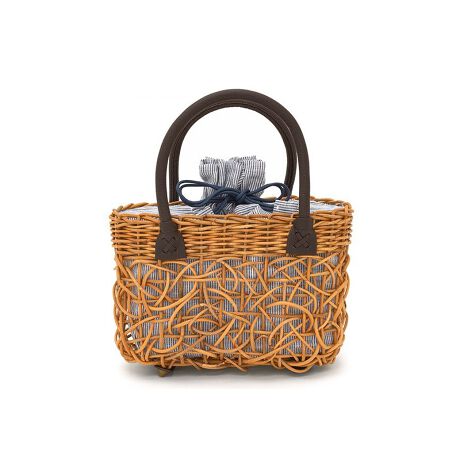 丸い曲線を描いた形の複雑に絡み合った籠に、シンプルなストライプの巾着がナチュラルな印象の定番かごバッグです。