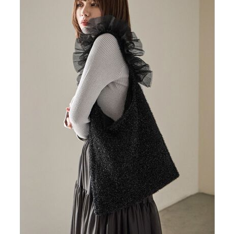 短めのラメニットとフリルハンドルがドレッシーなスタイルにもぴったり。