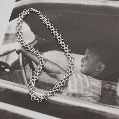 少しボリュームのあるチェーンと変形パーツを組み合わせたデザインが魅力。