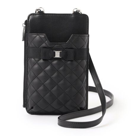 スムース調合皮にキルトステッチをかけた本体にグログランリボンをあしらいポイントに、エレガントな雰囲気をたっぷり詰め込んだミニポシェットです。前ポケットにはスマホが入り、背面にはカードス入れとサイドには小物などを入れるファスナーポケットがありコンパクトに収納できます。ショルダーストラップは長さ調節可能、ショルダーストラップを外せばバッグにに入れて持ち運ぶこともできます。
