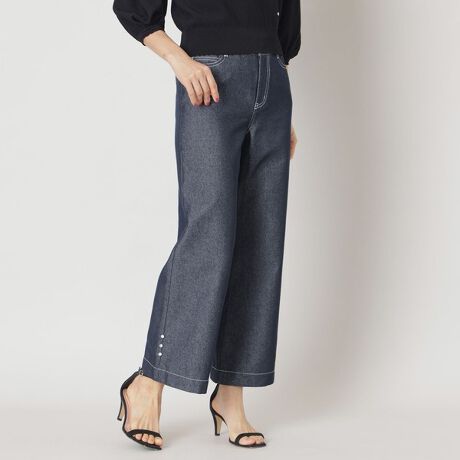 腿周りをスッキリさせ、裾にかけて程よく広がった美脚シルエットのデニム風パンツです。裾のラインストーンも華やかさにアクセントをプラスした1枚です。