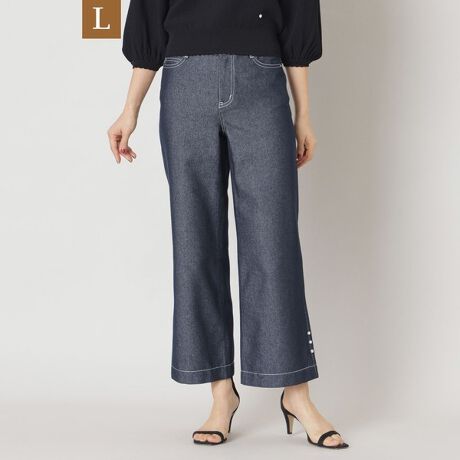 腿周りをスッキリさせ、裾にかけて程よく広がった美脚シルエットのデニム風パンツです。裾のラインストーンが華やかさをプラスした1枚です。