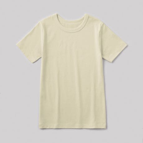 糸の撚りをほぐし、ワタの繊維に戻すことで柔らかさを実現しました。柔らかいだけではなく、しなやかに伸びてカラダにやさしくフィットします。さらに、洗濯タグをなくし、肌への刺激も軽減しました。