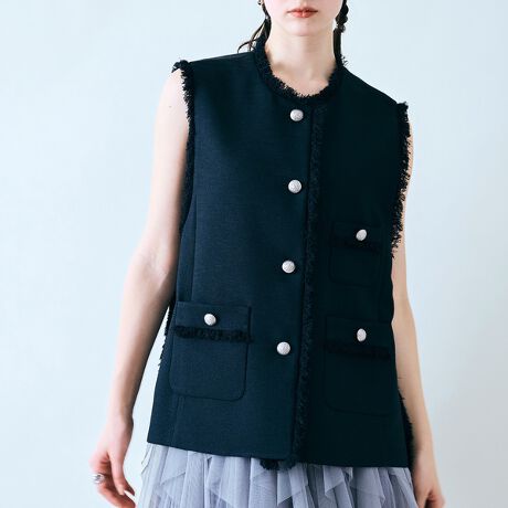 ・大きめのメタル調釦や、アームホールのフリンジデザインが着こなしのアクセントに。