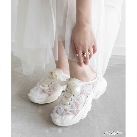 立体的なフラワーデザインとさりげないビジューの輝きが目を惹くスニーカーミュール。