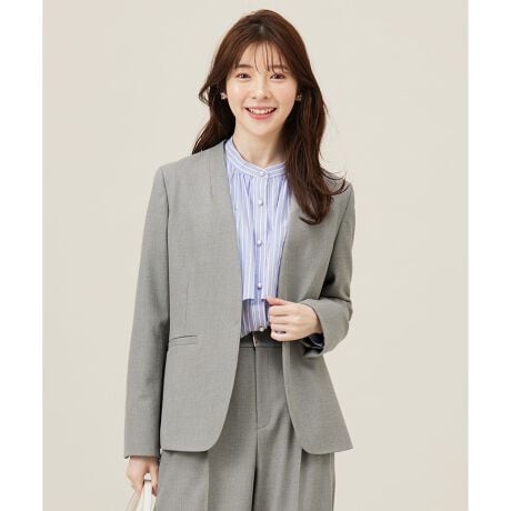 通勤やきちんと見せたい日には、同シリーズとのセットアップがおすすめ。シンプルなジャケットなので、インナーはどんなアイテムでも相性抜群。ボトムスにはテーパードパンツやワイドパンツはもちろん、フェミニン派には膝丈スカートがおすすめです。