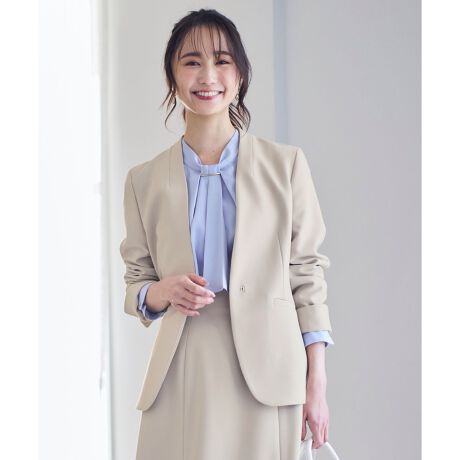 通勤やきちんと見せたい日には、同シリーズとのセットアップがおすすめ。シンプルなジャケットなので、インナーはどんなアイテムでも相性抜群。ボトムスにはテーパードパンツやワイドパンツはもちろん、フェミニン派には膝丈スカートがおすすめです。