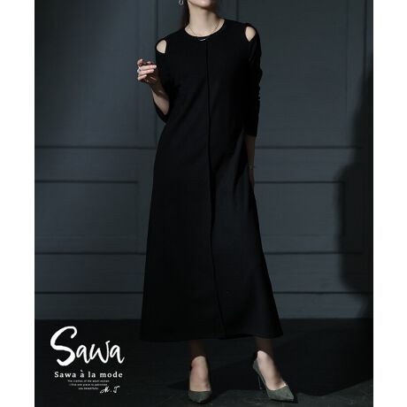 【ワンピース】 ニット オープンショルダー 長袖 ロング丈 センターシーム ブラック 黒 春 秋