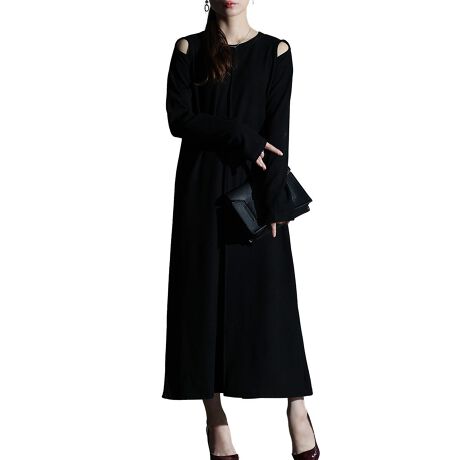 【ワンピース】 ニット オープンショルダー 長袖 ロング丈 センターシーム ブラック 黒 春 秋