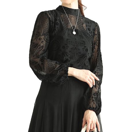マルイウェブチャネル   /   サワアラモード   /   トップス   /   Tシャツ・カットソー   /   【カットソー】 トップス ブラウス 黒 ブラック 長袖 シアー ハイネック パフスリーブ プリント